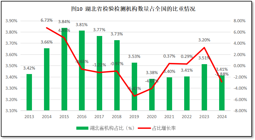 截至2024年末,湖北省检验检测机构数量为1811家,约占全国检验检测机构数量的3.41%,排名全国第10位,与2023年度持平。过去12年湖北省检验检测机构数量在全国检验检测行业中的占比以及占比的增长率,如图10所示。