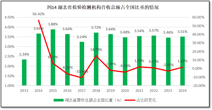 2024年度,湖北省检验检测机构营收总额为171.03亿元,占全国检验检测行业年度营业收入的3.51%,在全国检验检测行业中排名第8位,较2023年度排名提升1位。过去12年湖北省检验检测行业年度营业收入总额在全行业中的占比情况,如图14所示。