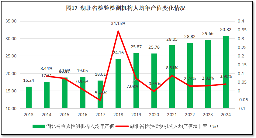 人均年产值是衡量检验检测机构经营运行质量的直观指标。2024年度,湖北省检验检测机构人均年产值30.82万元,首次超越30万元行业温饱线,距离2024年度全国31.45万元的人均产值也已经非常接近,排名居于全国第8位(由高到低排序),较2023年度提升了2位,排名处于全国前列。这表明湖北地区检验检测机构经营状况较好,劳动生产率相对较高,机构盈利能力不错。过去12年湖北省检验检测机构人均年产值的变化情况,如图17所示。