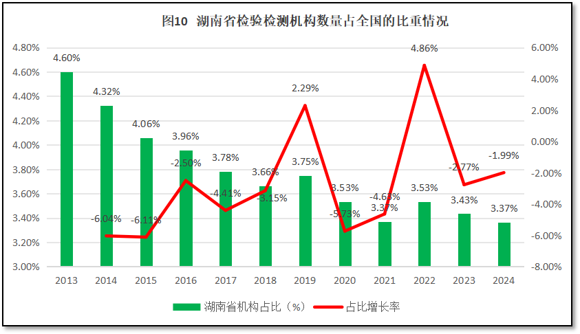 由图10可见,湖南省检验检测机构数量在全国检验检测机构总数中的占比总体呈现缓慢下降的趋势,从2013年4.6%的占比逐渐下降到2024年的3.37%,12年来占比的平均值为3.78%。从增长率的变化情况来看,多数年份度处于负增长,仅在2019年和2022年出现正增长,但增幅都不大。
